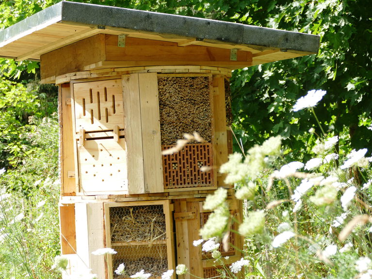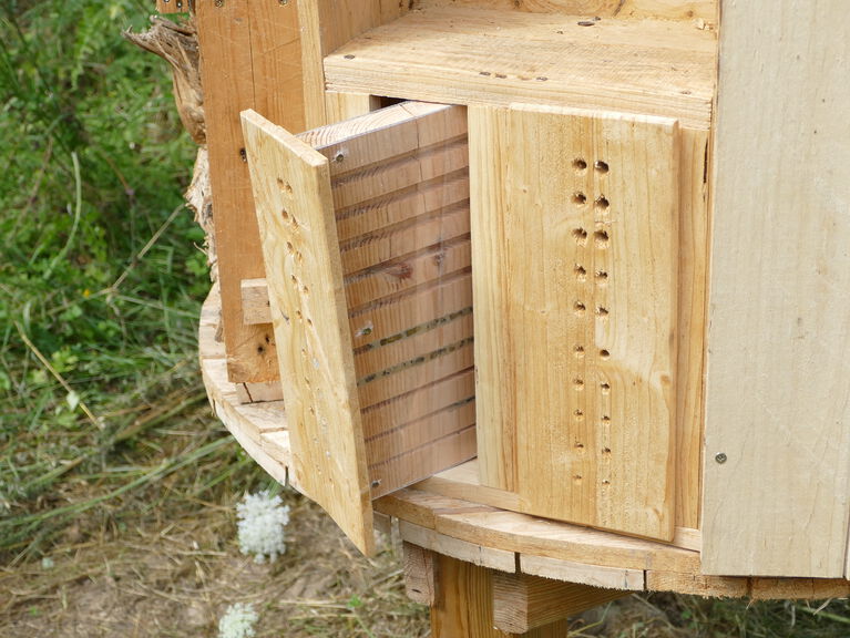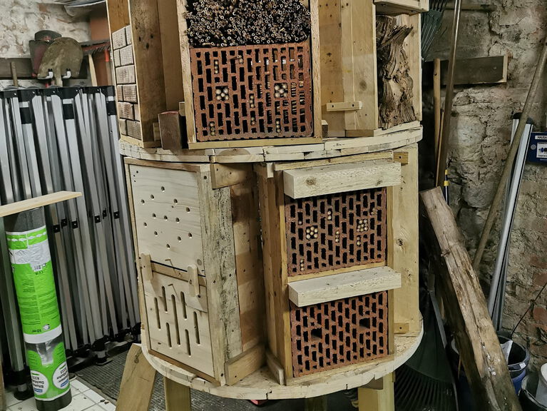Der Lebensturm steht in der Mitte der Fläche. Er ist aus Abfallholz erstellt und ist modular aufgebaut, Insgesamt wird er mindestens 2 Meter groß und biete Lebensräume für verschiedene Insekten, aber auch Nistmöglichkeiten für Vögel, Überwinterungsmöglichkeiten für Igel (fehlt noch) etc.