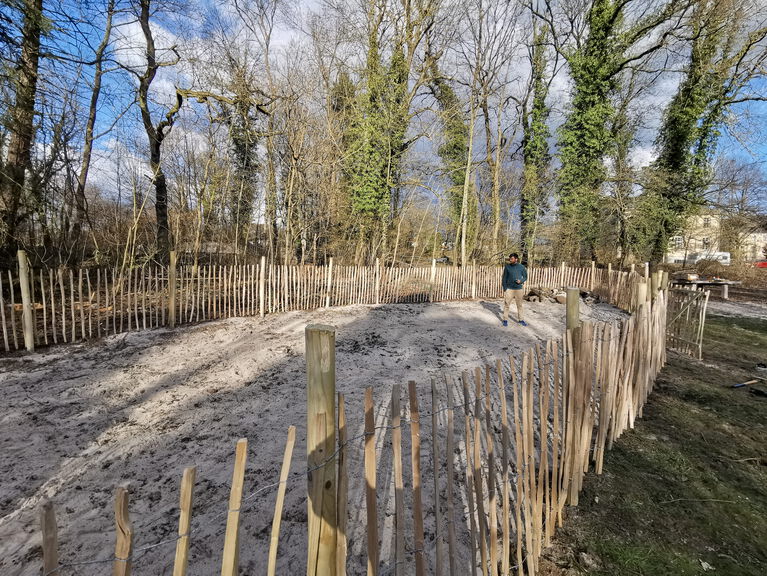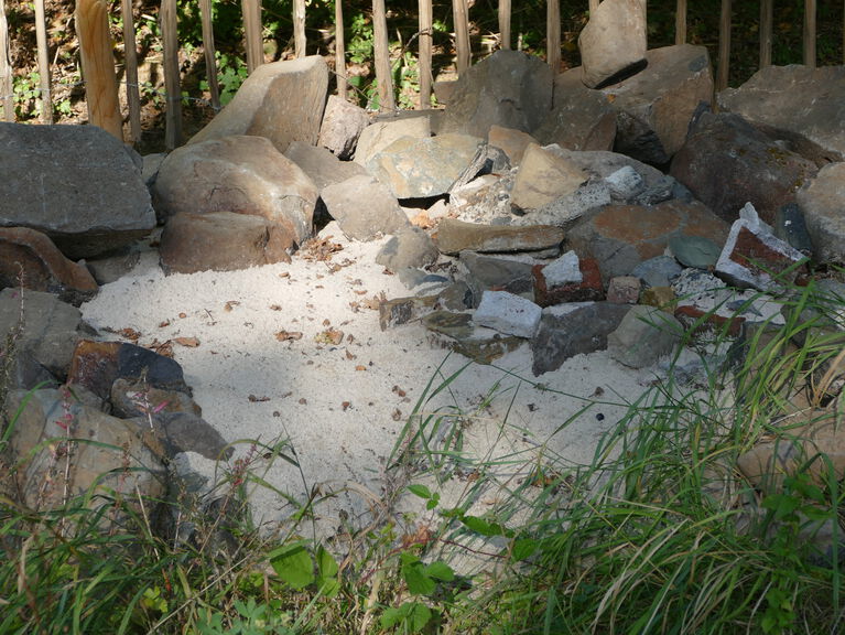 An einer sonnigen Ecke des eingezäunten Geländes befindet sich ein Sandbad für Reptilien mit einer kleinen Trockenmauer.